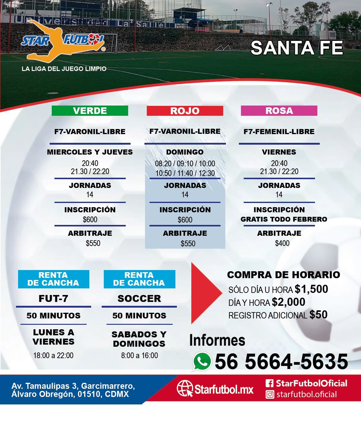 STARFUTBOL Santa Fé, nuestra primer sucursal en este estado, contamos con 18 años de experiencia como liga y hemos tenido en nuestras canchas mas de 5000 mil equipos.